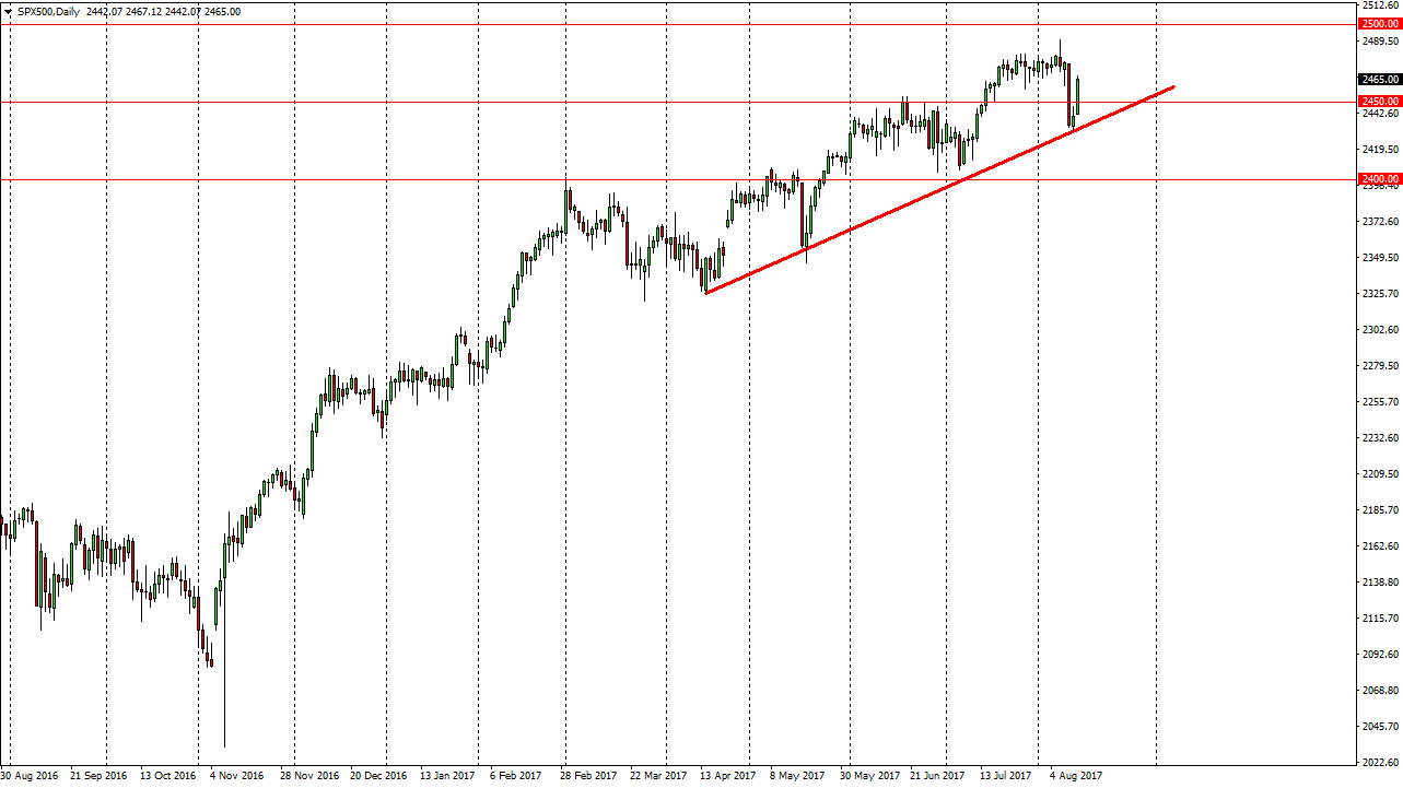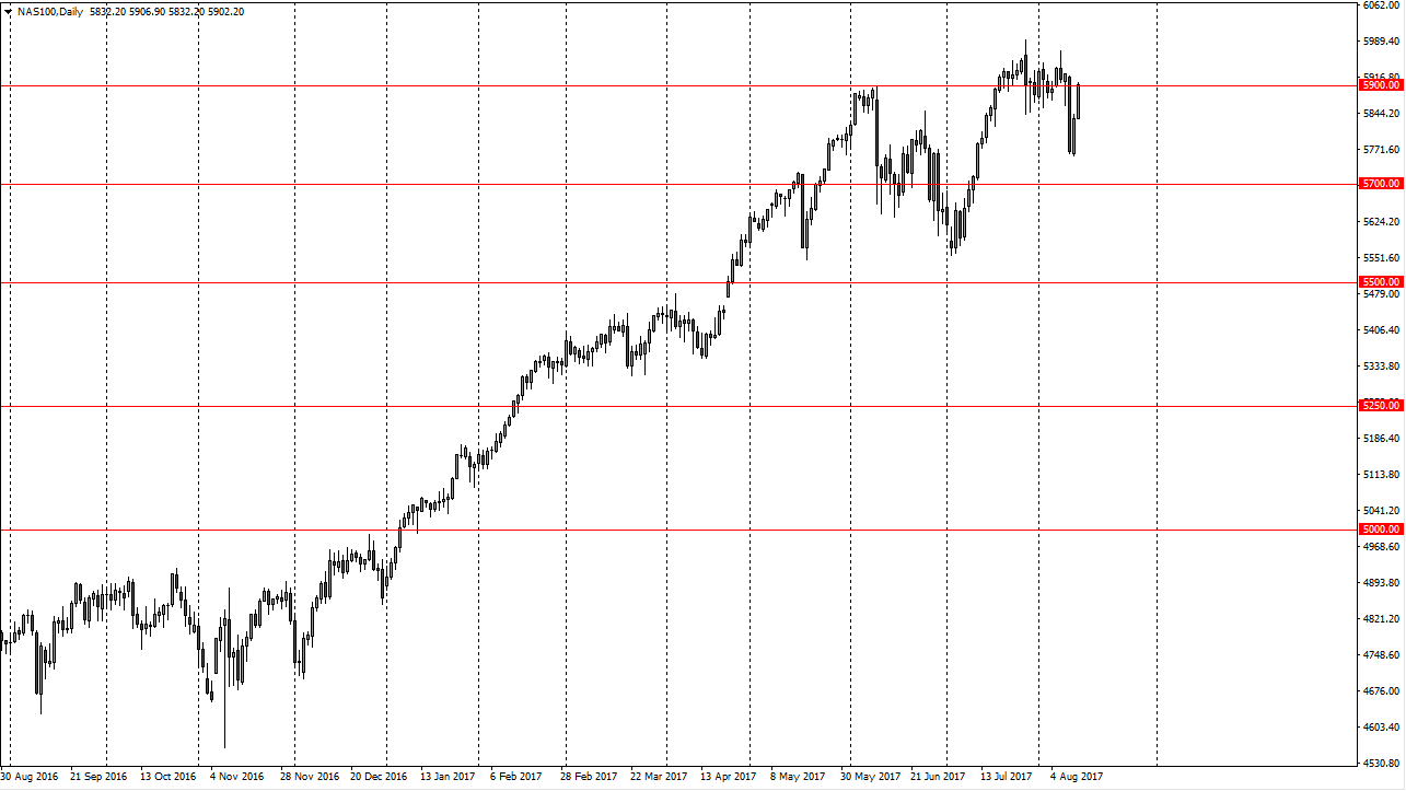 The S&P 500 exploded to the upside on Monday, breaking above the 2450 handle. Ultimately, this is a market that is still very much in an uptrend, and I think there’s no reason to think anything has changed. The pullback came in one session, and it was essentially about North Korea. This pullback is necessary, as we have seen far too much in the way of complacency. Now that we have had this massive move lower and an almost complete repudiation, I believe that the market is ready to start moving towards the 2500 level again. While we may get a short-term pullback, I believe that the uptrend line should still hold true, as it has for quite some time. I am a buyer of dips, just as we had seen during the Monday session.