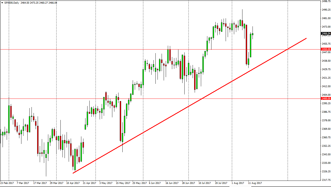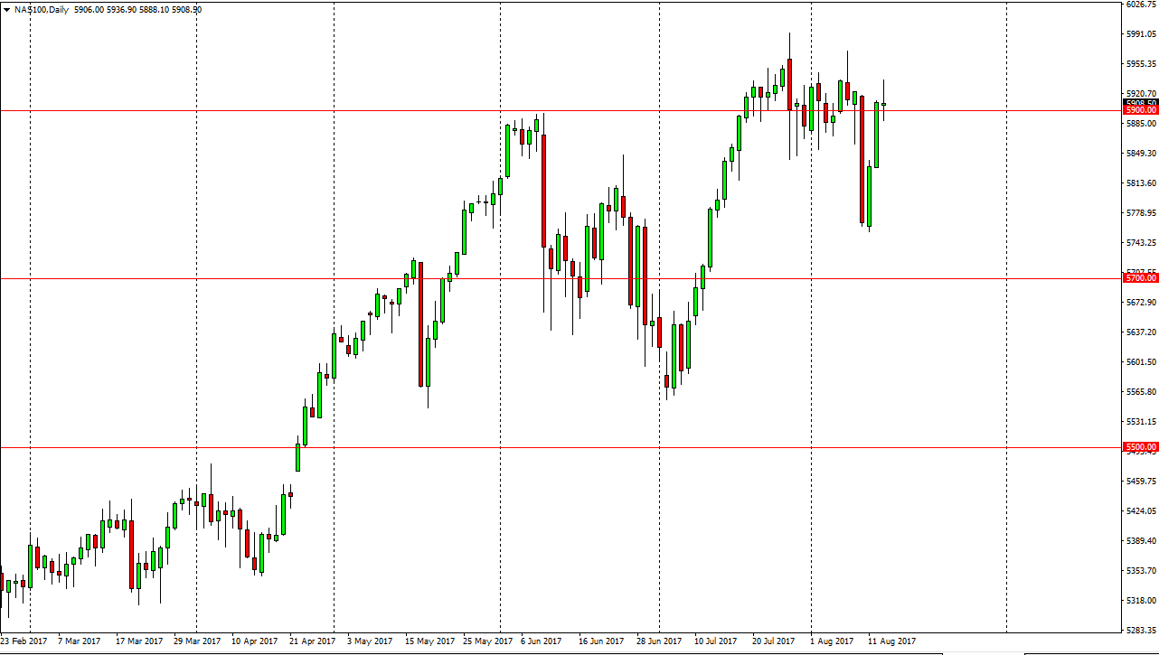 The S&P 500 went back and forth during the day on Tuesday, but ended up forming a bit of a shooting star. This suggests to me that we are going to see another pullback. As you can see on the chart, I do have an uptrend line market, and if we break below that I think things could get a bit ugly. We are starting to see people become somewhat concerned about the uptrend, and I am a bit discouraged by the fact that we could not break higher than the impulsive candle to the downside on Thursday. I’m not ready to start selling yet, but I do recognize that a pullback is likely. I will be looking for a supportive candle to buy at lower levels, or perhaps buying on a break above the top of the shooting star the form for the day on Tuesday.