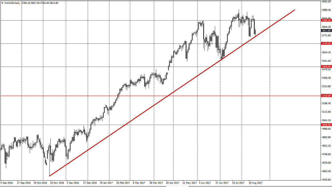 The NASDAQ 100 rallied during the day, bouncing from a trend line that has been in effect from November of last year. If we can rally here, the market will probably go looking towards the 5900 level. If that happens, then the other stock indices will probably rally. In the meantime, expect a lot of volatility but if we go below the 5770 handle, I would be very leery of this market as it will probably begin the selloff of several indices in the United States. I think the one thing you can count on is a lot of noise, but the NASDAQ 100 has lead the way for other indices recently, and that of course should continue to be the way you monitor the markets. Ultimately, the technology stocks have been the biggest boon for the US indices, and should continue to be the way forward. Because of this, it’s likely that the market will be one of the most followed charts over the next several sessions.
