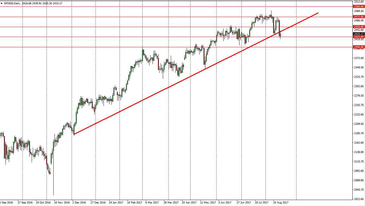 The S&P 500 had a positive session on Friday, using the 2425 level as support. However, we are below the uptrend line that has been so important and it offered a bit of resistance. Because of this, I think the next couple of sessions are going to be vital, and quite frankly I would stay away from this market. If we broke above the 2450 handle, then it’s an obvious bullish sign, just as a breakdown below the 2400 level would be obviously bearish. In the meantime, I expect to see a massive amount of volatility over the next couple of sessions, and that the S&P 500 might be a market to avoid as we have potential for significant moves.