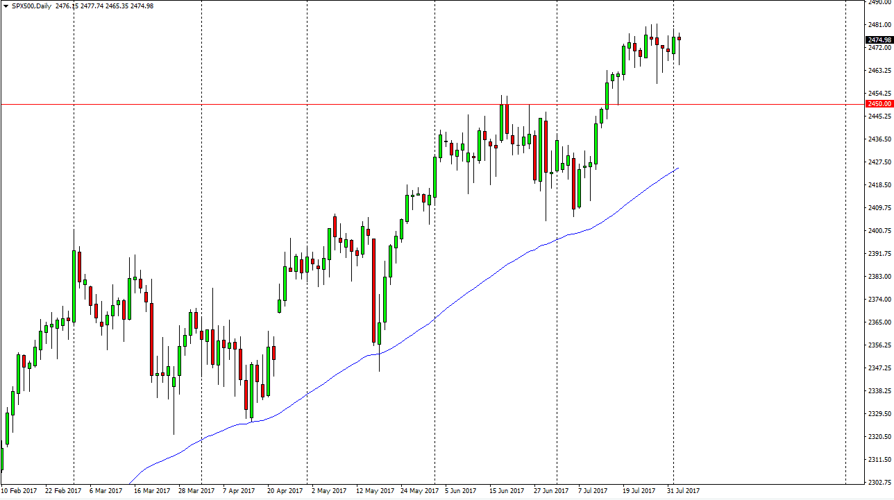 The S&P 500 fell significantly during the day on Wednesday again, but just as a we keep seeing, algorithmic traders are jumping into the market and picking up with a perceived as a move beyond standard deviation. Because of this, it’s likely that every time we dip, the buyers will continue to jump in. The 2450 level underneath should continue to be a “floor” in the market, as we are most certainly in an uptrend. I think that the market will eventually try to reach towards the 2500 level, and I look at these pullbacks as nice buying opportunities. Because of this, I remain bullish but I also recognize that tomorrow is the jobs figure, so it could be fairly quiet during trading today as US traders will most certainly be on the sidelines and waiting for that important information.