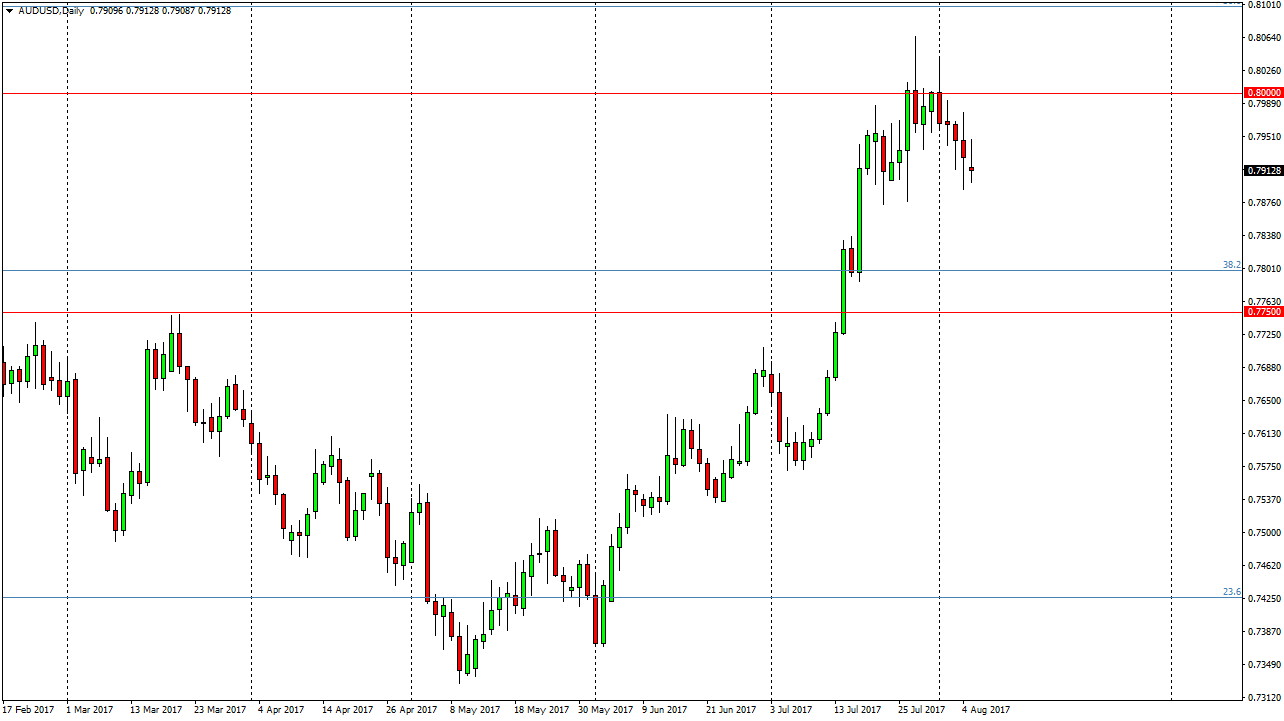 The Australian dollar had a slightly negative session after volatile trading on Monday. Ultimately, I think that this market is trying to roll over and a breakdown below the 0.79 level is likely. The 0.7750 level under that should be supportive though, so I’m not looking for anything major. I think that this pullback is indicative of what we are seeing in the gold markets, and quite frankly they are not supporting the Aussie at the moment. I don’t think were in a breakdown drastically, I just believe that this pullback is necessary as we have not retested the previous resistance barrier found at the 0.7750 level for support. That’s classic technical analysis, so a little bit of a drift lower could be expected over the next several sessions. The 0.80 level is a major barrier that goes back decades, so it will take a significant amount of momentum to break through.