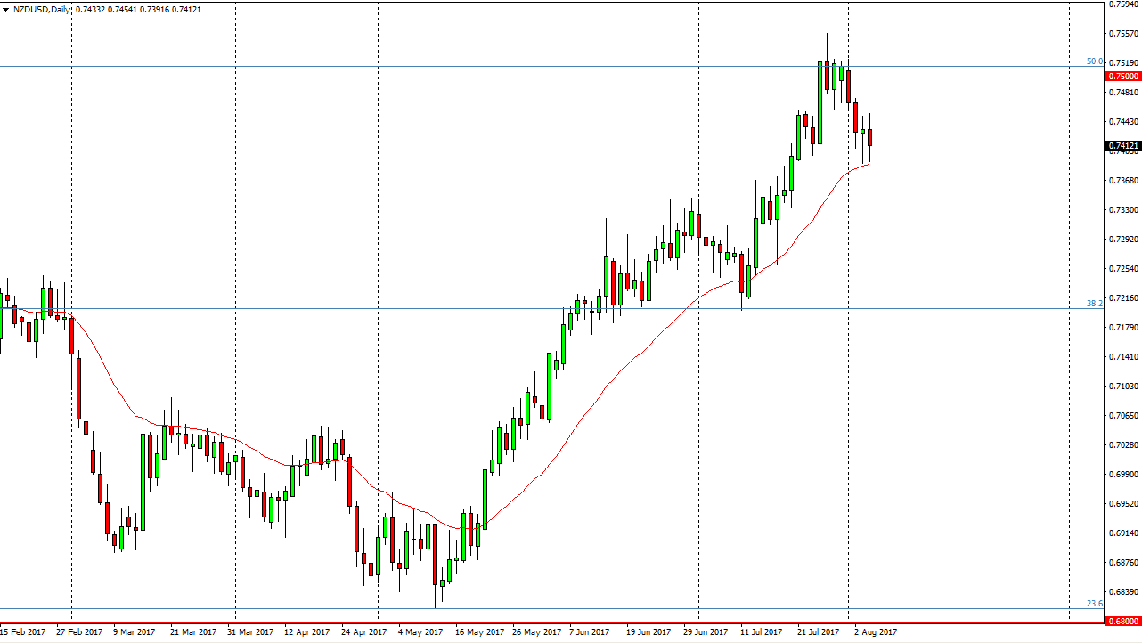 The New Zealand dollar fell slightly during the day as we continue to see negative pressure. However, the market looks like we are going to pull back, reaching towards the 0.73 handle. I think it’s only a matter of time before we bounce and start going towards the 0.75 handle. The market should continue to see quite a bit of noise, and keep in mind that the New Zealand dollar is highly sensitive to the commodity markets in general. If we do break below the 0.73 handle, I think the next target is the 0.72 level. Overall, the US dollar should continue to strengthen, and that will put a bit of a muting effect on any type of rally in this market. I think that we will see a general consolidation, and therefore a lot of back and forth short-term trading is probably what we’re looking at and the kiwi dollar of the next several sessions.