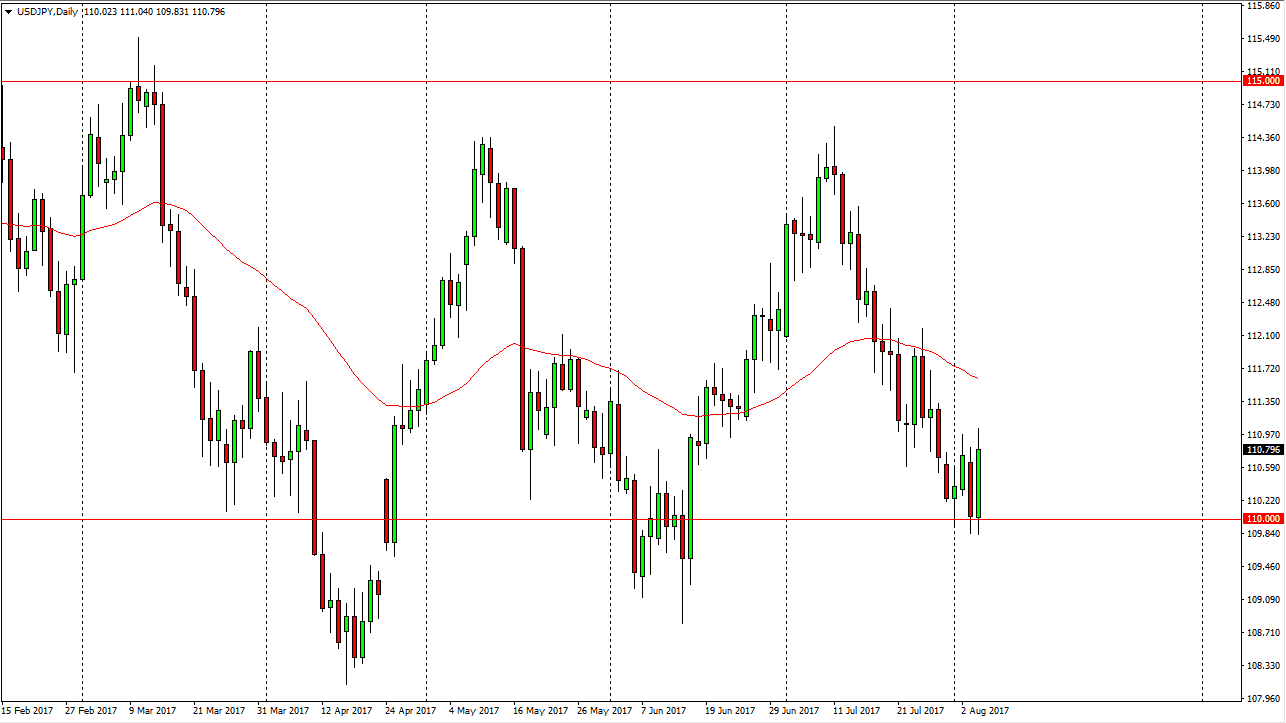 The US dollar exploded to the upside during the session on Friday as the jobs number came out much longer than anticipated. We were sitting at the 110 level, which has a certain amount of psychological importance, and of course has been supportive structurally as well. This being the case, and we ended up forming a nice bullish candle and I think that a break above the top of the candle for the session on Friday census market much higher. I believe that the 112.50 level will be the next target, and then eventually the 114.50 level. The market continues to consolidate longer-term, and this simply continues that pattern. However, I would be the first to point out that the lows are getting higher, and that means that we are starting to see buyers become a bit more aggressive.