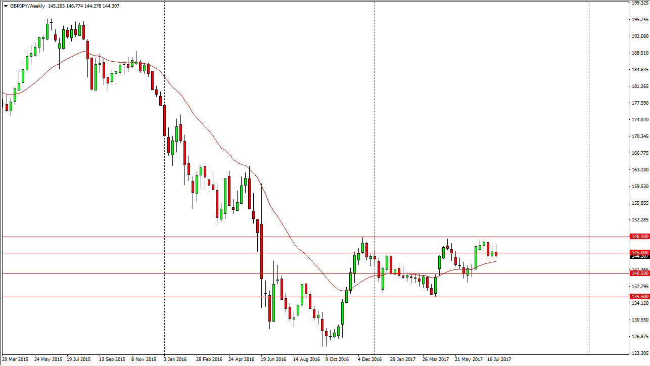 The British pound initially tried to rally during the week but found quite a bit of resistance above. This was exacerbated by the Bank of England suggesting the interest rate hikes are coming till 2018, and therefore sent the British pound tumbling in general. I think that the shooting star for the week suggests that a move below the 144 handle should bring sellers back into the market and could lead to a significant fall.