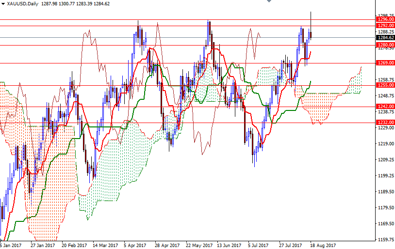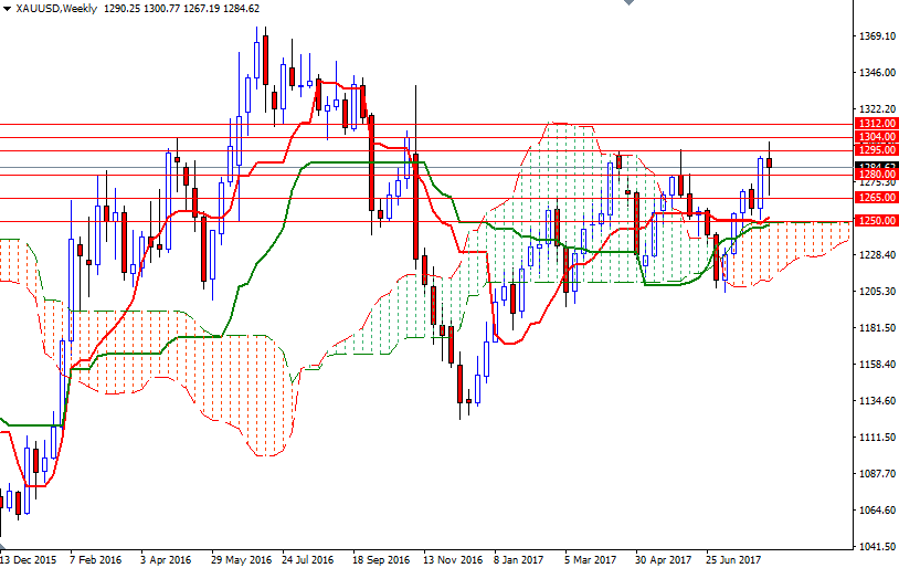 However, as I mentioned several times in the past weeks, there are strong barriers ahead such as 1296/5 and 1308/4 and price won’t have much room to go as long as they remain intact. If XAU/USD breaks through 1308/4, look for further upside with 1312 and 1319 as the next targets. To the downside, the initial support sits at 1280, followed by 1274. A break below 1274 indicates that 1269 or perhaps 1265/2 will be the next target. The bulls have to convincingly pull price below 1262 if they intend to challenge the bulls on the 1250 battlefield, the top of the weekly cloud.