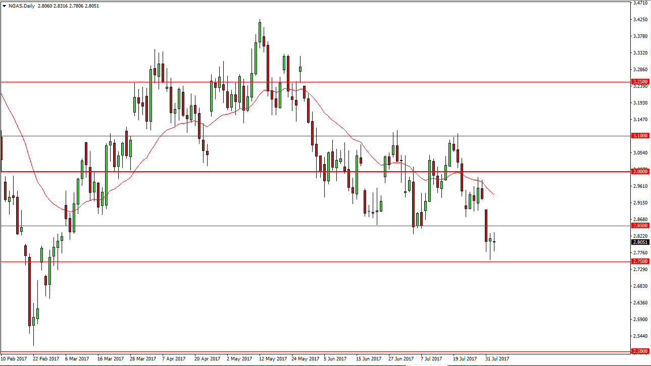 The natural gas markets went back and forth during the day on Wednesday, as the 2.75 level continues to offer support. After all, we formed a nice-looking hammer on Tuesday, so I suspect that we could get a bit of a bounce. However, there is a nice gap somewhere near the $2.90 level, so any rally at this point in time will probably have selling opportunities above. A breakdown below the 2.75 level would send this market much lower, perhaps towards the $2.50 level after that. I am bearish of this market longer term anyway, and the fact that we break down below the $2.85 level suggests that we are going to continue to collapse. I have no interest in buying this market until we can break above the $3.10 level, something that looks all but impossible right now. Volatility will continue to be an issue, but I still believe that rallies are to be sold.