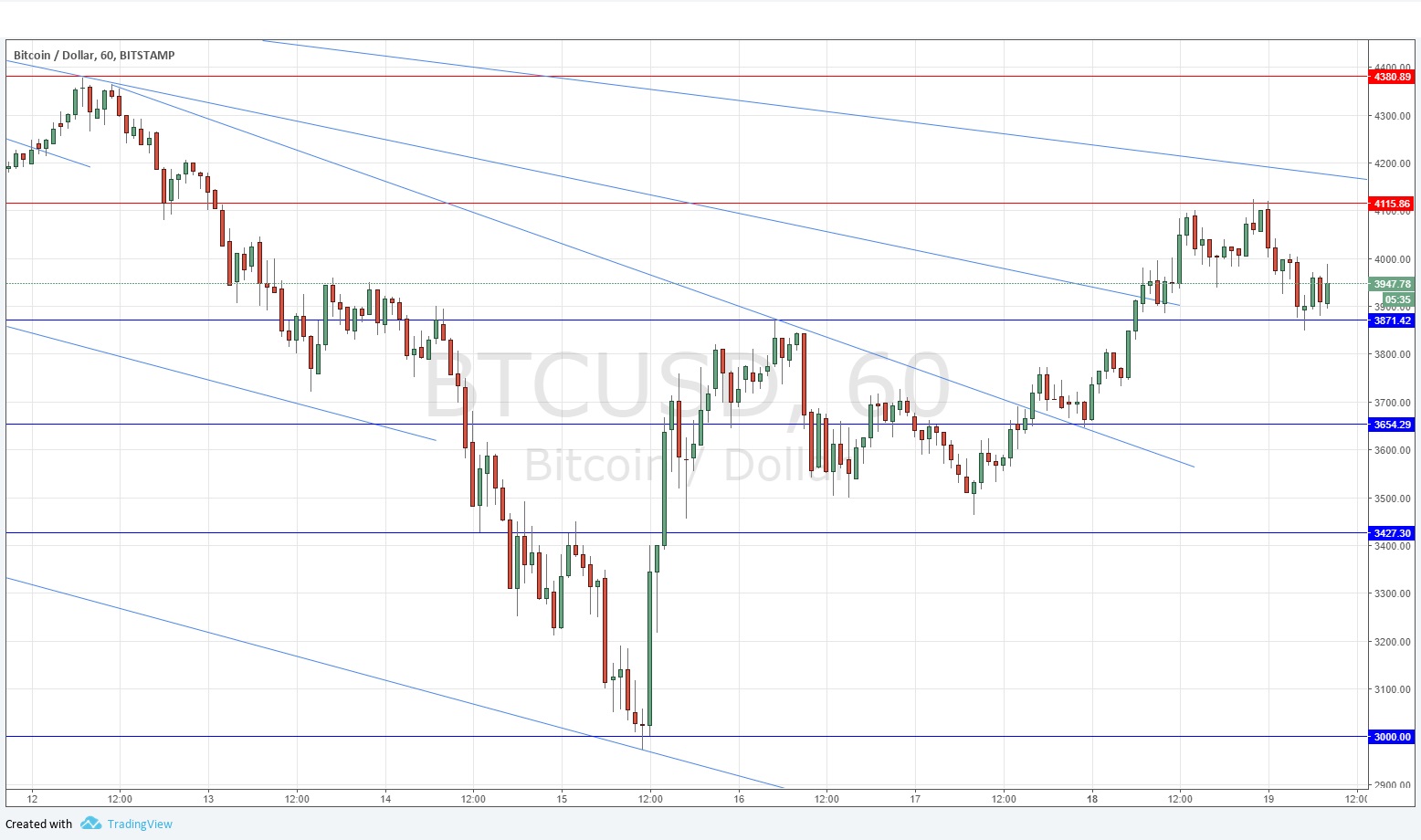 I wrote yesterday that Bitcoin now has a much more bullish outlook, but the final bearish trend line at $4200.00 and the resistant area around $4000.00 would probably be a difficult test. This is a good description of how things have played out over the past 24 hours, with the price exceeding $4000.00 for a while but ultimately falling back below it, before seeming to print a new higher low generating a new support level at $3871.42.
