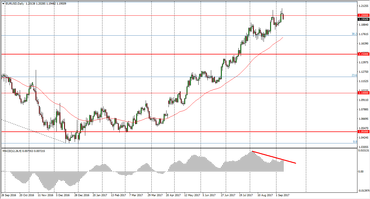 The euro rallied initially on Monday, but then rolled over and fell through the 1.20 level. By doing so, we are now seeing divergence on the MACD against price action. This suggests to me that this correction could continue a bit, and I think that the relief rally in the US dollar has a little bit of way to go. The hurricanes did not cause major issues over the weekend, and I think there will be a little bit of positivity coming out of America because of this. Nonetheless, the longer-term trend is to the upside and I think that this pullback will end up being a buying opportunity in a few sessions. I expect the 1.1750 level to be supportive, and most certainly the 1.15 level after that. If we did break above the top of the shooting star from the session on Friday, that’s a very bullish sign and has this market looking for the 1.25 handle.