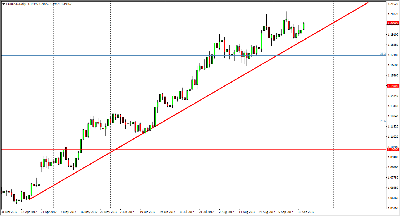 The EUR/USD pair had another positive session on Tuesday, testing the 1.20 level yet again. However, I think that some traders would’ve been a bit hesitant to get involved in the market ahead of the Federal Reserve meeting and statement today. I believe that the Federal Reserve will probably be dovish, after the significant damage done by a pair of hurricanes, and a third one on its way. Because of this, it’s likely that this pair will end up going higher given enough time. I also recognize that the longer-term target based upon the previous consolidation area is the 1.25 level, and a mix of easy Federal Reserve monetary policy and the ECB stepping away from quantitative easing could be the catalyst to drying this market much higher over the longer term.
