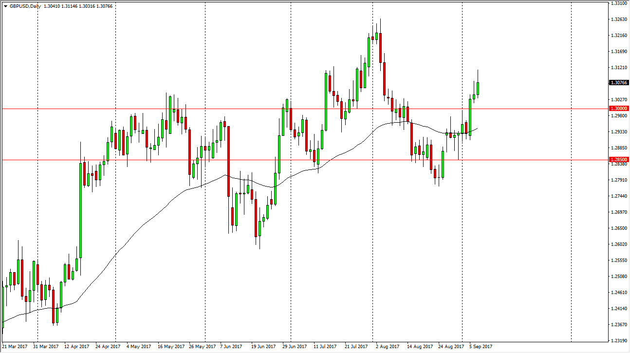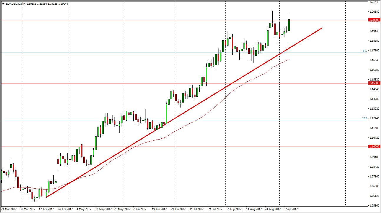 The EUR/USD pair rallied a bit during the day on Thursday, breaking above the 1.20 level. We did stop just about at that level, so I think we need to make a fresh, new high to start buying. In the meantime, we could get pullbacks that are attempts to build up momentum to finally make that move. You can clearly see on the daily chart there is a nice uptrend line that keeps this market to the upside, and based upon the recent breakout of the 3-year consolidation, I am still of the mind that this market goes to the 1.25 handle. Ultimately, I believe that buying on the dips will probably be the best way going forward, as this is a market that will probably grind its way to the upside as the Federal Reserve looks very unlikely to be able to raise rates in the wake of 2 hurricanes.