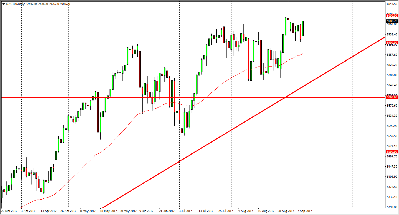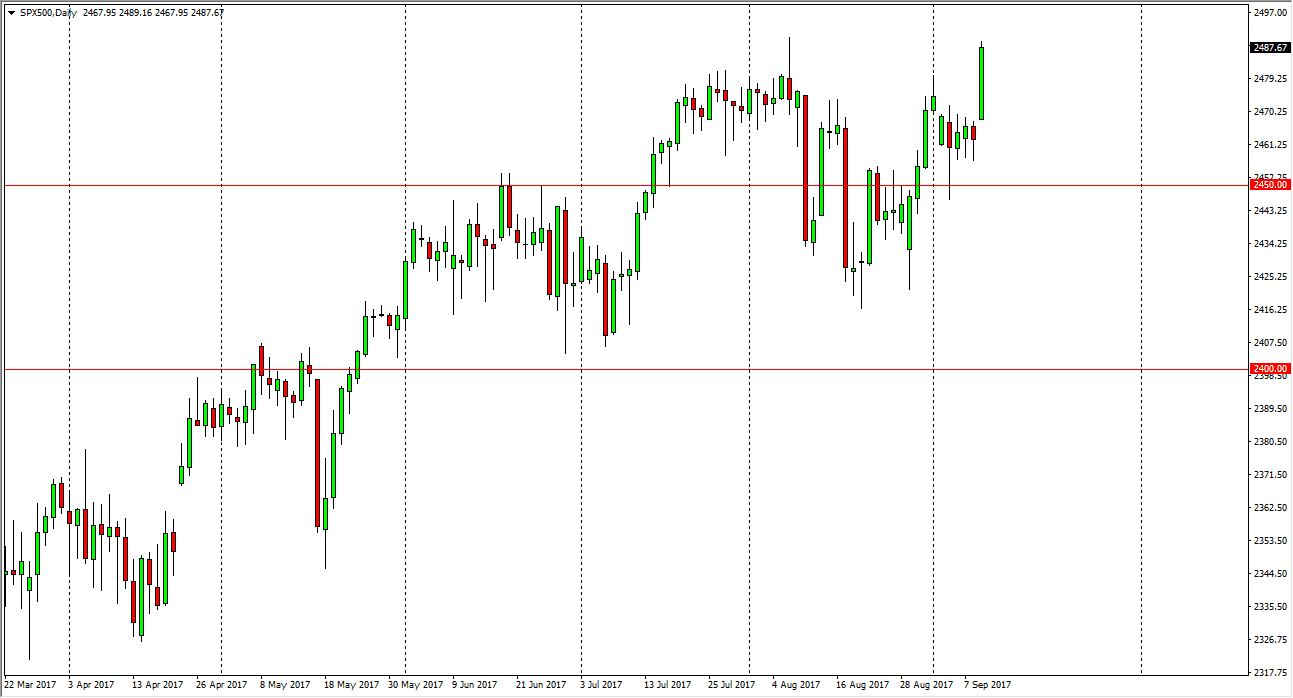 The S&P 500 rallied significantly on Monday as the weekend it did not bring any major bad news. We avoided escalation with North Korea, and of course the hurricanes, although dangerous, did not lay the path of destruction that was once anticipated in the United States. Because of this, the S&P 500 got a bit of a relief rally, and is now pressing the absolute highs. I still see the 2500 level above as massive resistance, and I think it’s going to take a bit of momentum building to get above it. Short-term pullbacks will probably present themselves as buying opportunities, and that’s how I’m looking at this market, as a market with a “buy on the dips” mentality still. I have no interest in shorting the S&P 500 currently.