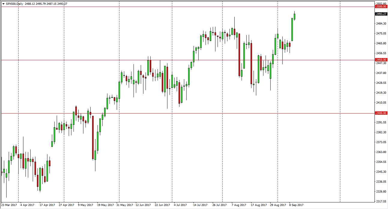 The S&P 500 had another bullish session on Tuesday, as we continue to reach toward the 2500 level. It’s likely that we will continue to see resistance near 2500, so I think it’s only a matter of time before we pull back. I do believe that we eventually break out, but we may need to pull back to build up momentum in the meantime. If we were to clear the 2500 level on a daily close, I believe then it’s time to start buying for a longer-term move. In the meantime, I think short-term dips will offer buying opportunities as the market tries to build up the necessary momentum to break out for the longer-term move higher. I have no interest in shorting, I believe there is more than enough interest underneath to keep this market afloat.