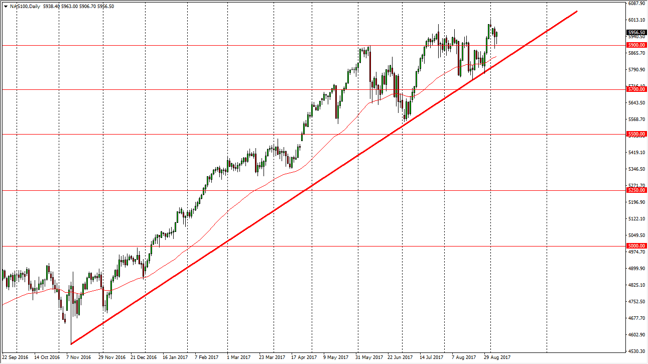 The NASDAQ 100 initially fell during the session on Wednesday, testing the 5900 level again. We turned around to form a hammer, and that is a very bullish sign. We had formed a hammer during the previous session as well, so I think that the market will eventually find the buyers. The 5900 level has been rather important, but we also have an uptrend line that sits just below it, so I think that the market will eventually go looking towards the 6000 level again, and if we can break above there I think that the market should continue to go much higher. The NASDAQ 100 has been a leader of US stock indices in general, and I think that will continue to be the case. Ultimately, this is a “buy on the dips” market, and has been for some time.