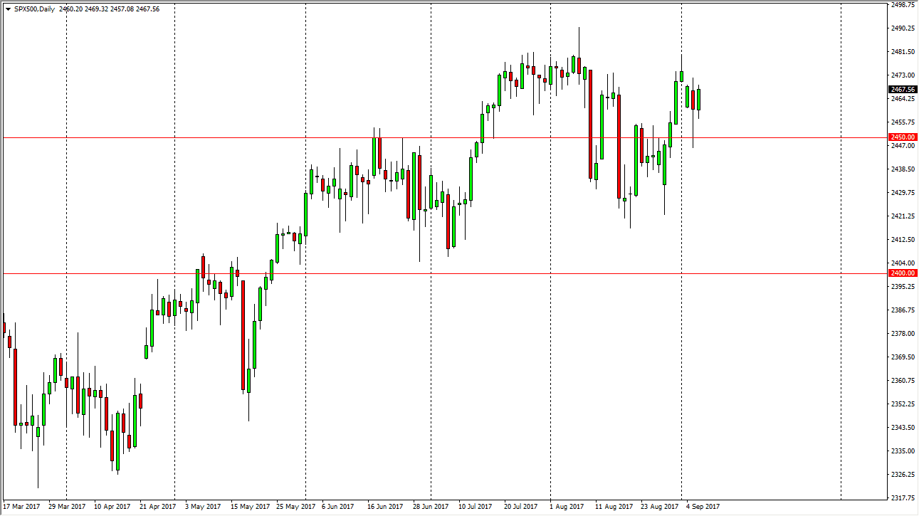 The S&P 500 had a slightly positive session on Wednesday, as we continue to churn above the 2450 handle. It looks as if the market is trying to find its footing to go higher, and perhaps reach towards the 2500 level. Ultimately, I think that the 2450 level underneath is going to be supportive as well, so I think that we will eventually see buyers jump into this market and push it higher. It seems as if every time we dip, the buyers come in to take advantage of value. Ultimately, this is a market that is trying to find a reason to go higher, so I think that selling isn’t much of an opportunity, and it’s likely that we will see buyers down to the 2400 level underneath. Although the market hasn’t had a substantial pullback recently, I still think that there’s plenty of buying pressure underneath.