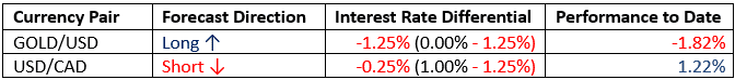 For the month of September, we forecasted that the best trades would be long Gold and short USD/CAD. The performance to date is a little negative overall: