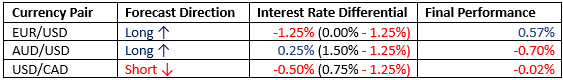 For the month of August, we forecasted that the best trades would be long EUR/USD and AUD/USD, and short USD/CAD. The final performance was very slightly negative: