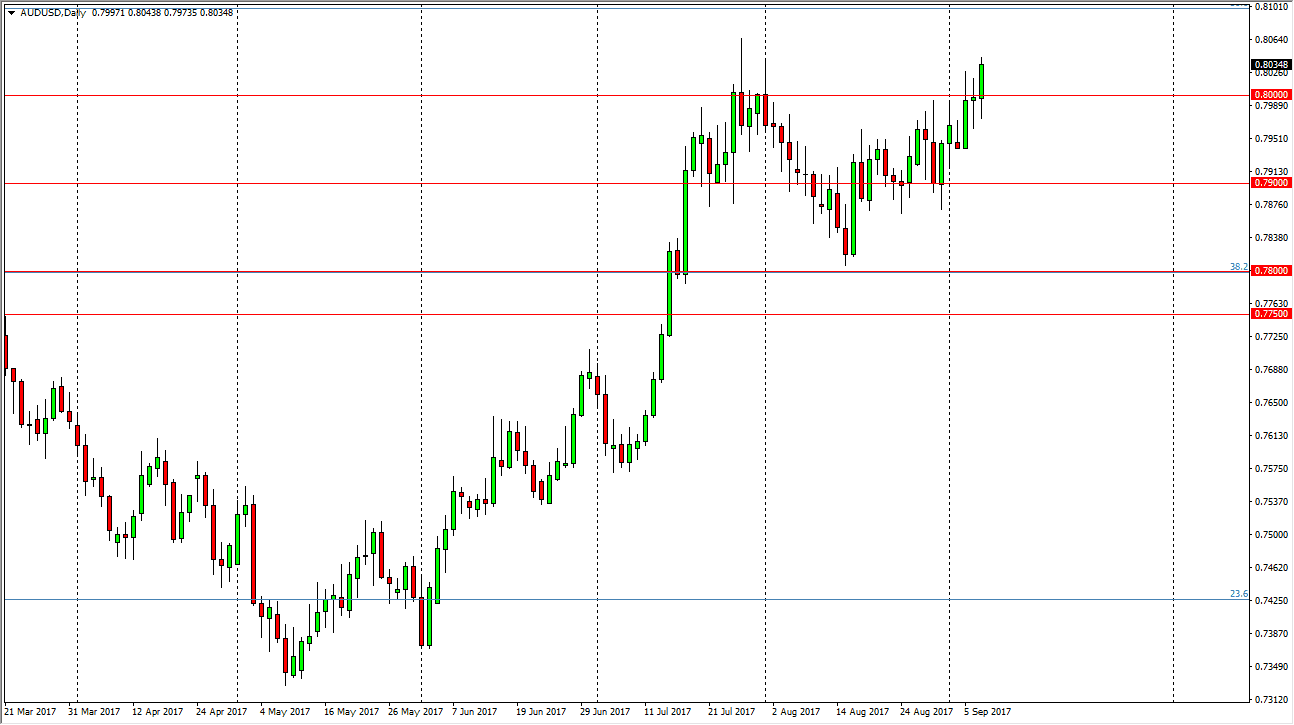 The Australian dollar initially fell during the trading session on Thursday but managed to break above the 0.80 level, and is doing something that I have not seen it do yet: close above that level. Because of this, I am bullish of this market and I think that the breakout is imminent. Longer-term, I anticipate that this market will go looking for the 0.90 level, and then eventually parity. Nonetheless, I would expect a lot of noise, but I think a lot of what we are because the market acknowledging that the hurricanes hitting the United States will make it almost impossible for the Federal Reserve to raise rates with any type of velocity. I think that short-term pullbacks will be buying opportunities, and that being the case I think that adding small positions in various bits could be the best part of this market as we can build a large core position. Selling isn’t a thought.