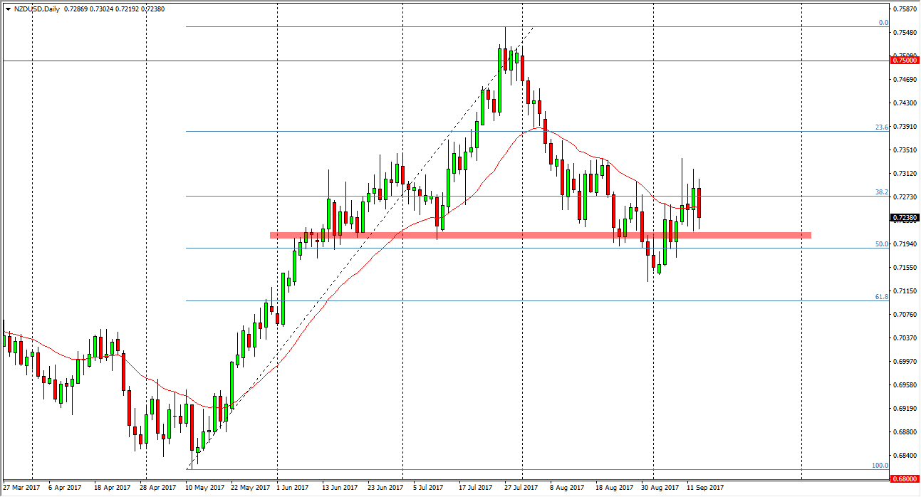 The New Zealand dollar fell precipitously during the trading session on Wednesday as well, as it was announced that there is hope for a tax deal after all in the United States. This was less about the New Zealand dollar that it was about the US dollar, but quite frankly we are a long way from some type of agreement. Because of this, I look at this is a buying opportunity as the 0.72 level has held so far. When you look at the chart over the last several weeks, we have seen quite a bit of interest in this area, so I’m looking for more consolidation, meaning that we should rally from here. I’m not looking for a major move, but I do recognize that the status quo will probably be kept. With this, I don’t have any interest in shorting, least not yet and I believe that the buyers will come back after this knee-jerk move during the US session.