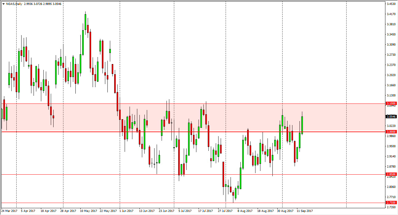 Natural gas markets have been extraordinarily volatile as of late. When you look at the last couple of weeks, it has literally been back and forth. With today being inventory day in the United States, it’s likely that we will see more volatility. The $3.10 level above continues to be massive resistance, and I think if we can break above there and more importantly close above there, that would be a very bullish sign. It would be a bottoming pattern of roughly $0.35, meaning that we should extend the move to the $3.70 level, but probably would take several months to get there. Alternately, and I believe a scenario that might be easier, we find far too much in the way of resistance just above, and start to roll over. However, keep in mind that the inventory numbers don’t come out until 3:30 PM GMT, so it may take a while to get the reaction that will tell us where we are going next.