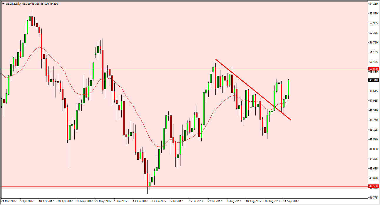 The WTI Crude Oil market initially dropped a bit at the open on Wednesday, but found plenty of support and continued the rally that we have seen over the last couple of sessions. Being preceded by 2 hammers, this should not have been a huge surprise, and I think at this point were going to go looking for the $50 level. That would be a continuation of the move after the downtrend line break, but I think there is going to be a significant amount of resistance near $50. Short-term traders will be far too tempted to test the area and not to go long, but I need to see a daily close above $51 to get bullish longer term. Even then, we probably have a ceiling somewhere closer to the $55 level.