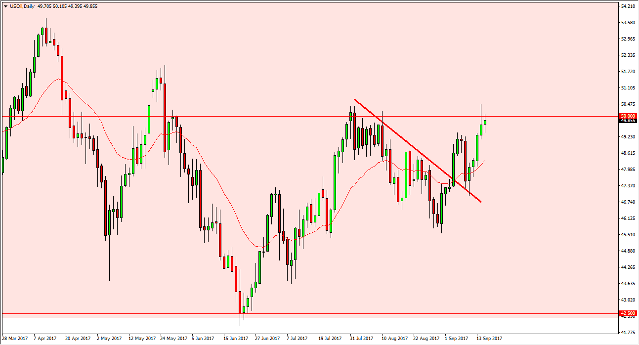 The WTI Crude Oil market initially fell on the open on Friday, but then turned around to test the $50 handle. It looks as if we will try to break out, and if we can clear the top of the shooting star from Thursday, I feel that the market goes higher. A breakdown below the bottom of the Thursday candle would be negative, but I think that it looks very bullish currently, and I think that eventually the buyers will take out the $50 handle, at least for the short term. Volatility should continue, but quite frankly I think that the buyers are a little bit more serious than the sellers currently. Once we do breakout, I suspect that the $52 level will offer a bit of resistance.