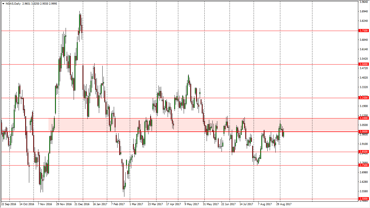 Natural gas markets rallied a bit during the day, but you can see there is a certain amount of resistance just above the $3.00 level, so I think that the sellers are probably going to be coming back as hurricane Irma should start to turn away from any natural gas infrastructure. Ultimately, the market should go down to the $2.85 level, and you can see that the massive resistance from the $3.00 to the $3.10 level has held, although we certainly had quite a bit of excitement in this market to the upside. Ultimately, the oversupply of natural gas has not change, this is a short-term pop in a market that continues to struggle with demand issues. Given enough time, I think we can break down below the $2.85 as well, but obviously that is going to take a significant amount of momentum building. If we somehow broke above the $3.10 level, that would be a very bullish sign.