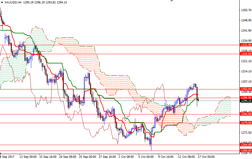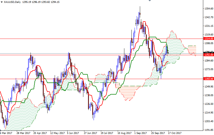 Gold prices moved lower on Monday as the dollar clawed back some of its recent losses. In economic news, the Federal Reserve Bank of New York reported that manufacturing activity in the region jumped to 30.2 from 24.4 a month earlier. The XAU/USD pair is currently trading at $1294.15, slightly lower than the opening price of $1295.19. Gold has rebounded nearly 2.7% since hitting a two-month low of $1260.51 on October 6.