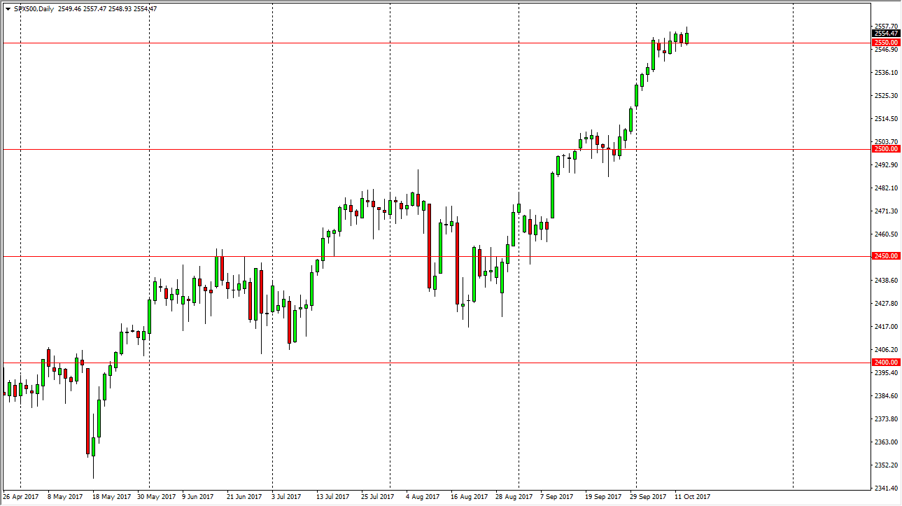 The S&P 500 continues to show resiliency, as we rallied during the day on Friday. The 2550 level looks to be offering support, and with earnings season kicking off this week, we had seen money flowing into the index anyway. I think that eventually we will break out to the upside, but I’m the first person to admit that we are bit parabolic at this point. We need sideways action at the very least, if not a pullback. Because of this, I would be very cautious, but I certainly wouldn’t be shorting a market that has shown so much promise as of late. With interest rates rising, it should continue to offer bullish pressure to the financials, which has a significant effect on how the S&P 500 performs. I believe that the 2500 level underneath will continue to be massively supportive.
