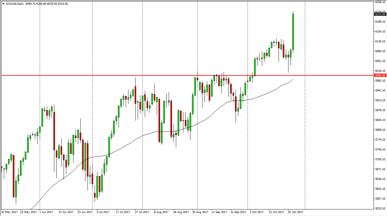 The NASDAQ 100 broke out to the upside during the day, clearing the 6200 level which has been my target for several weeks. After we broke out of the ascending triangle the 6200 level was important, and the target, but I think that we will eventually go much higher. Based upon the candle that we formed for the Friday session, it’s obviously that the buyers are still very much into the market, and I think now that the 6000 level is the floor. Longer-term, I think we go to the 6500 level, but we are getting a bit stretched in most equities around the world, and especially in the United States. Because of this, I need to see pullbacks instead of buying at the highs, because quite frankly, the higher we go with this point, the more likely the pullback is going to be brutal. Wait for value, it will present itself on those pullbacks.