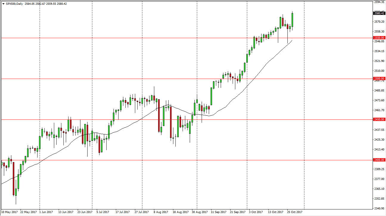 The S&P 500 rallied during the day on Friday, showing strength at the end of the session, meaning that larger institutional buyers are probably stepping into the market yet again. It looks as if the 2550 level is going to offer support, but quite frankly I think we are getting a bit overextended. Pullbacks should be buying opportunities, even though it could be rather choppy. I think that the 2500 level underneath there is also supportive. I look at buying this market on pullbacks is the only way to deal with it, because buying up at these high levels would be chasing the trade. Expect trouble at the 2600 level, which should be psychologically resistant, but I think given enough time we will probably go beyond there as well.