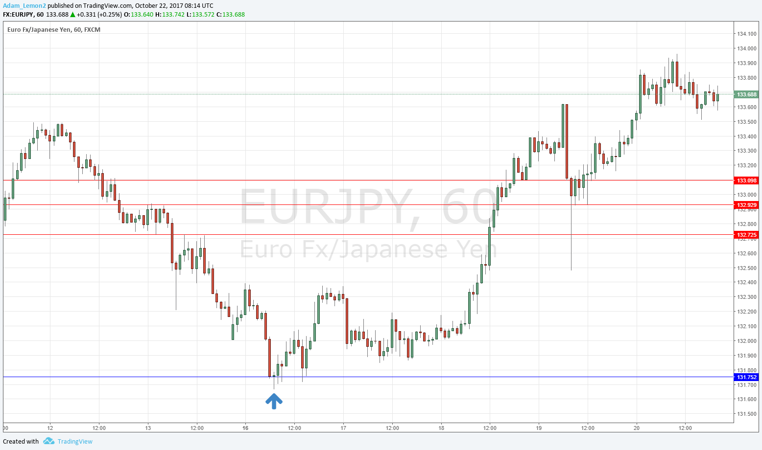 We had expected the level at 131.75 might act as support, as it had acted previously as both support and resistance. Note how these “flipping” levels can work well. The H1 chart below shows how after holding more or less to the exact pip, the price bounced bullish off this level and made a small bullish pin candlestick which broke bullishly straight away (marked by the upwards arrow in the chart), during the London session, which is typically a good time to enter a trade in a currency pair involving the Euro. The maximum reward to risk ratio reached has so far been extremely good, more than 14 to 1, although the stop loss has not yet been reached so the result could yet be better still. This excellent result is partly because the risk on the entry candle is only approximately 15 pips. Usually, larger pin candlesticks are more likely to provide better entries than smaller ones, but it worked well in this case.