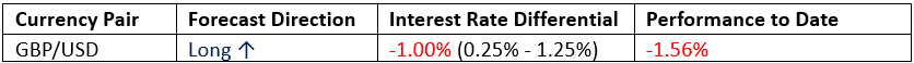 For the month of October, we forecasted that the best trade will be long GBP/USD. So far, the performance has been negative:Table 02