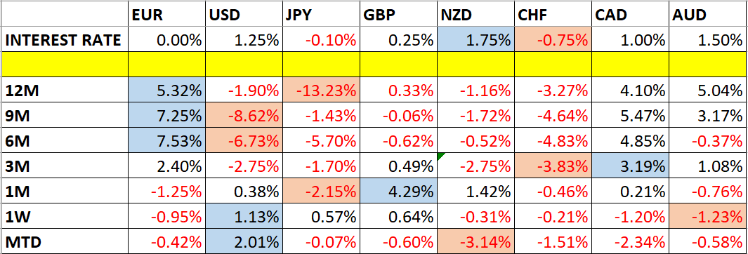 Let’s take a look at the relevant data of currency price changes and interest rates to date, which we compiled using a trade-weighted index of the major global currencies: