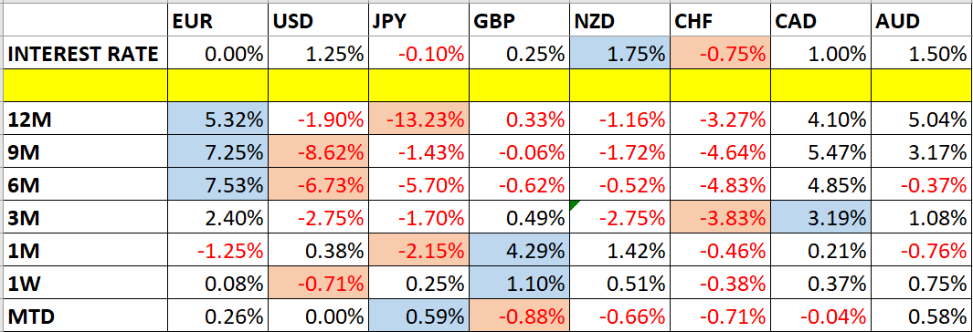 Let’s take a look at the relevant data of currency price changes and interest rates to date, which we compiled using a trade-weighted index of the major global currencies:
