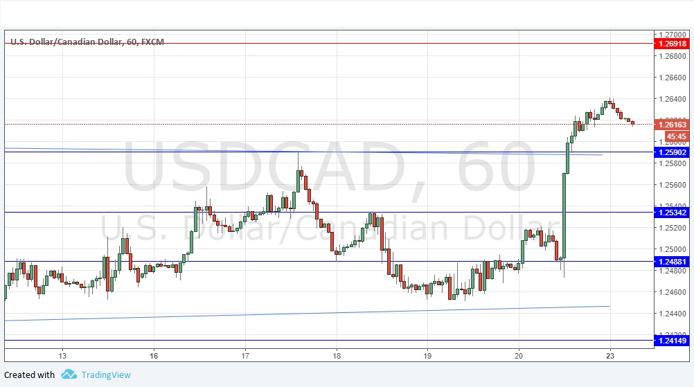 I wrote last Thursday that it seemed likely that the best opportunity which might arise here would be a long trade following a bullish reversal as close to 1.2400 as possible. Although the price did not make a new low any closer to 1.2400, it did rise strongly, flipping a couple of former resistance levels to probable support. The USD has been selling off widely over recent hours, and it looks as if the price is going to come back down now, so we should wait and watch for reactions at any support levels which are reached. There is no strong long-term trend in this pair, but the USD is likely to remain generally strong until Wednesday at least, so keeping a long bias will probably be the best approach here. I see 1.2534 as the stronger level, more likely to hold than 1.2590.