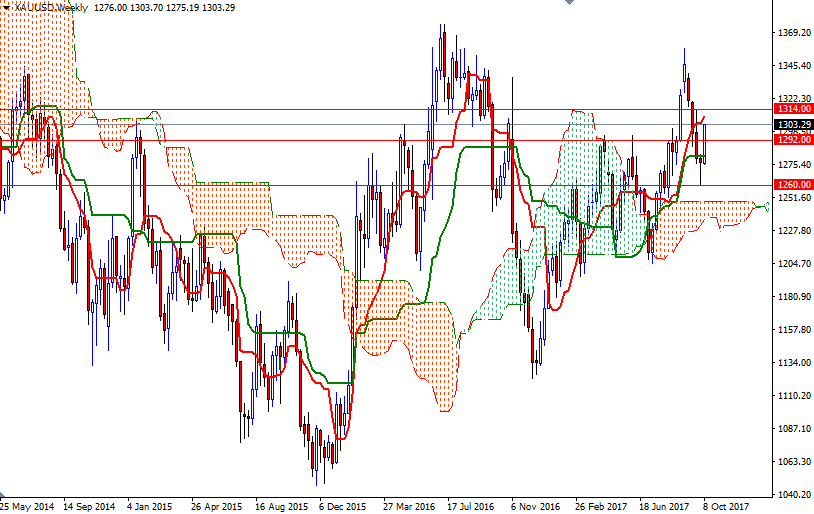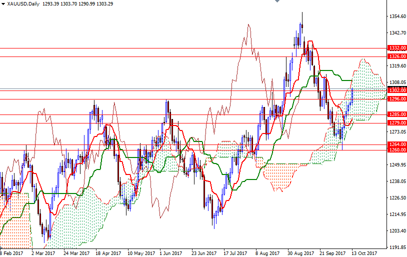 XAU/USD extended its gains after the broken 1292-1289 resistance flipped to support and pushed prices higher. Prices and the Chikou-span (closing price plotted 26 periods behind, brown line) are back above the Ichimoku cloud on the 4-hour chart. However, note that the market is still within the borders of the daily cloud and the Tenkan-sen (nine-period moving average, red line) and the Kijun-sen (twenty six-period moving average, green line) are negatively aligned.