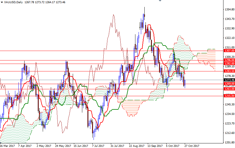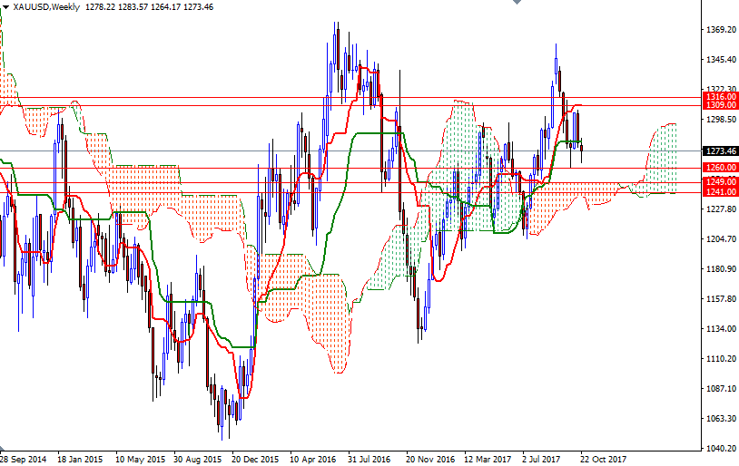 However, note that the market is still above the weekly cloud and in order to reach there the bears have to successfully drag prices below the 1263/0 zone. In that case, look for further downside with 1255 and 1249/7 as the next targets. A daily close below 1247 implies that the market is getting ready to visit the support in 1241/39. To the upside, the initial resistance sits in 1276/5 and the bulls have to clear this barrier so that they can find a chance to make an assault on 1283.50-1280. A break through there brings in 1292/0 (the top of the 4-hourly cloud). Beyond that, the 1297/6 area stands out as a strategic resistance. Closing above 1297 on a daily basis suggests that the market will be aiming for 1302.