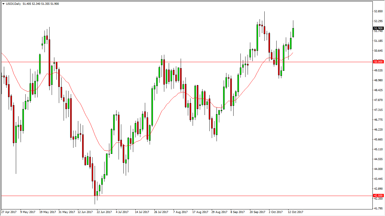 The WTI Crude Oil market continues to show strength, and now that the Iraqi Army has entered Kurdistan, there are a lot of concerns when it comes to the disruption of oil around the world. That being the case, we did see a bit of a rally, but I would point out the fact that we have failed to make a fresh, new high, and I think that there is more than enough resistance above to keep this market from going any higher. If we do breakout to the upside, the market will probably go looking towards the $55 level, which I think is the absolute top in the market. A pullback from here makes a lot of sense, but I think there is plenty of support down at the $50 level underneath. I think we continue to see choppiness, and therefore I’m ambivalent about trading this market.