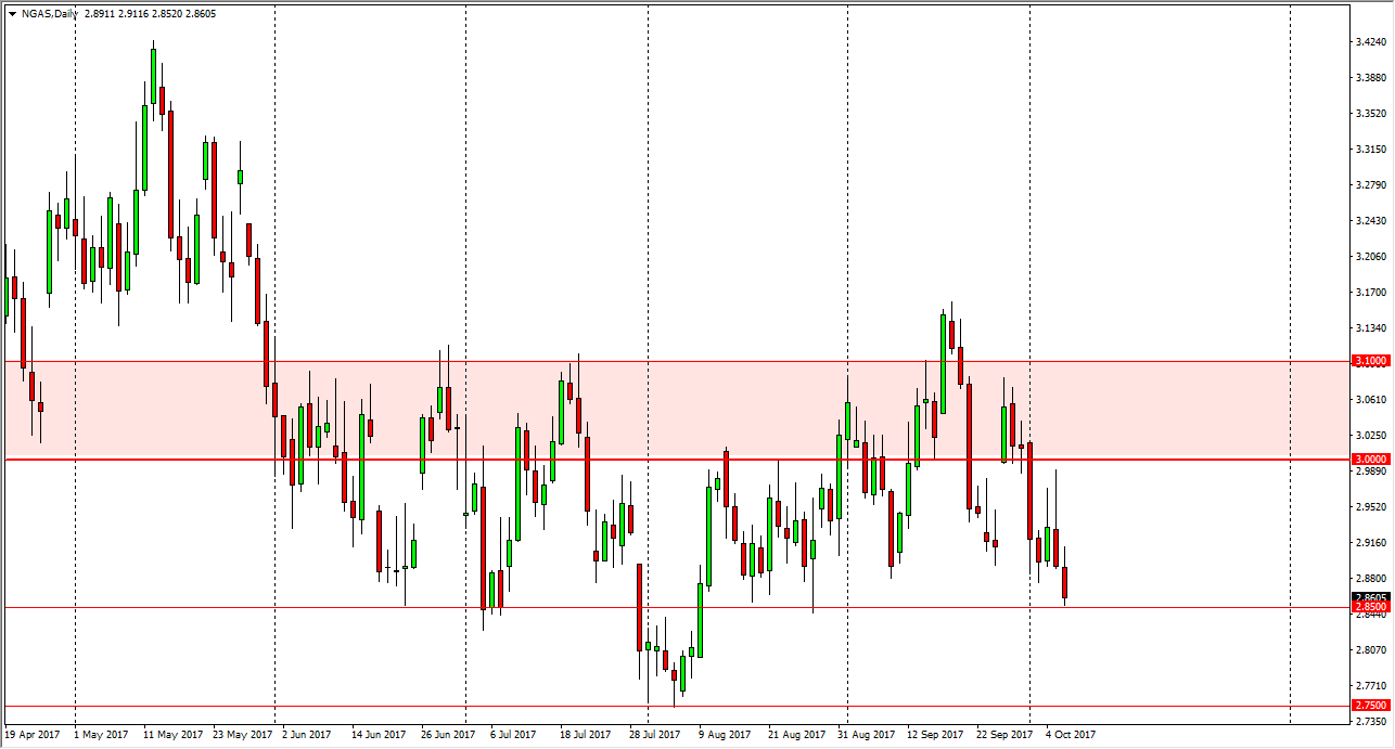 Natural gas markets tried to rally on Friday but ended up rolling over and testing the $2.85 level. This level has been supportive in the past, so it’s not surprising to see that the market could break down below it. However, if we did breakdown below that level, I think the market will go looking towards the $2.75 level for support. That level is even more supportive than the $2.85 level, so I think we will continue to see buying on the occasion. However, I believe that the overall bearishness continues, and that given enough time the market will break down below every time we rally. Rallies are to be sold, as there is a significant amount of supply above the $3 handle. This is because US fracking companies become profitable above that level, ensuring that there will be mass quantities available.