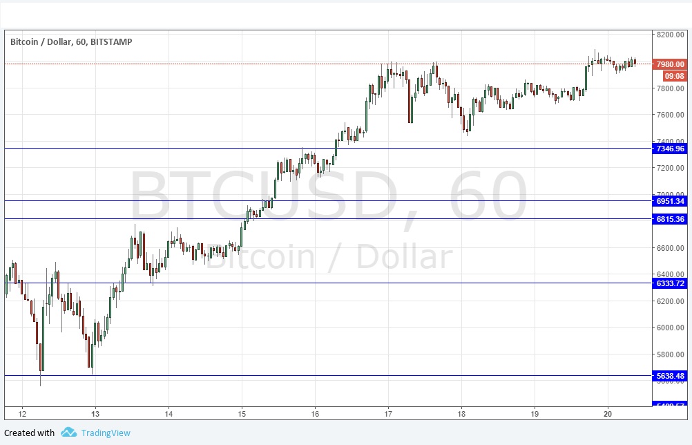 Bitcoin made a new all-time high price a little above $8000.00 during yesterday’s New York session. It has risen by more than 50% in value in just one week! The upwards movement has printed new, higher support levels and invalidated all important potential resistance levels. Although the strength of the rise has slowed over recent hours as the impact of Bitcoin clearing $8000.00 is absorbed, there is no reason to be anything other than very bullish, even though the price might now require a deeper retracement before advancing again to make new higher highs. The only obstacle to watch out for above would be the extremely psychologically significant price of $10,000.