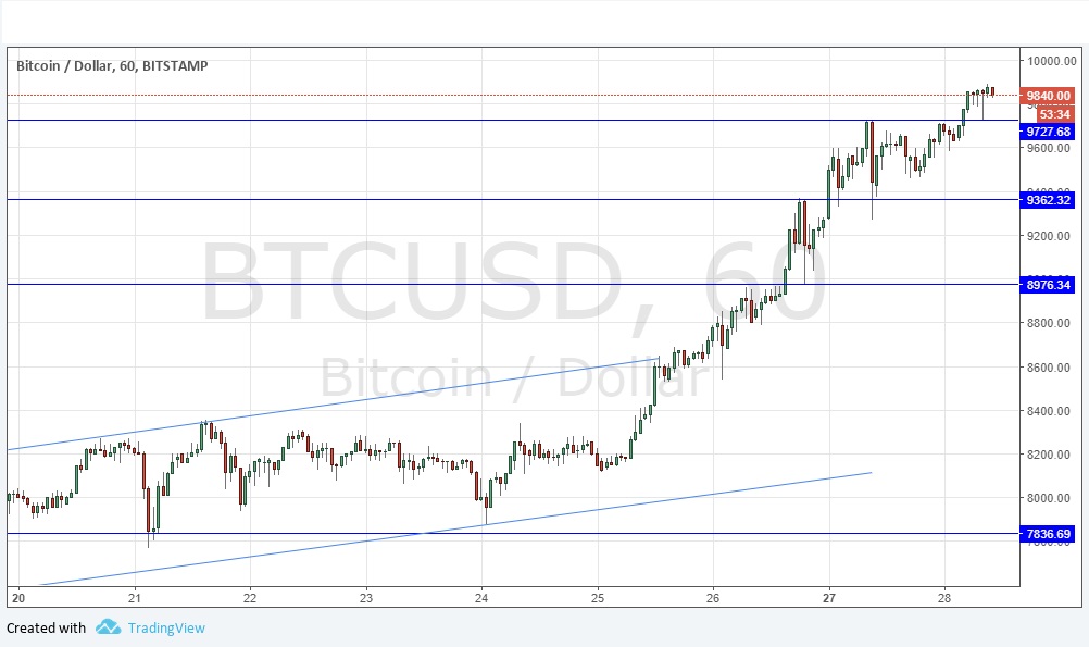 The price failed to reach the psychologically important level of $10,000 yesterday, but it looks highly probable that it will happen today. Yesterday’s move was muted with a strong hour of selling kicking in at $9727.68, but the way there was a fast recovery after the fall and as the price action has now flipped the level to support, suggests there will be continuing bullish movement now.