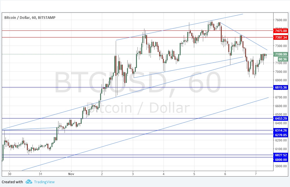 The picture is less bullish, but still bullish overall. The price action of the past few hours suggests that the price is going to break out above the short-term bearish trend line shown in the chart below and rise further beyond that. On the bearish side, note that a recent higher support level has been invalidated. It is possible that the price might reverse at the trend line and take out the recent lows, but even if this happens, the support at $6815 is still likely to hold. If it were to break down, that would be a more strongly bearish sign that the price might be undergoing a more serious bearish pullback.