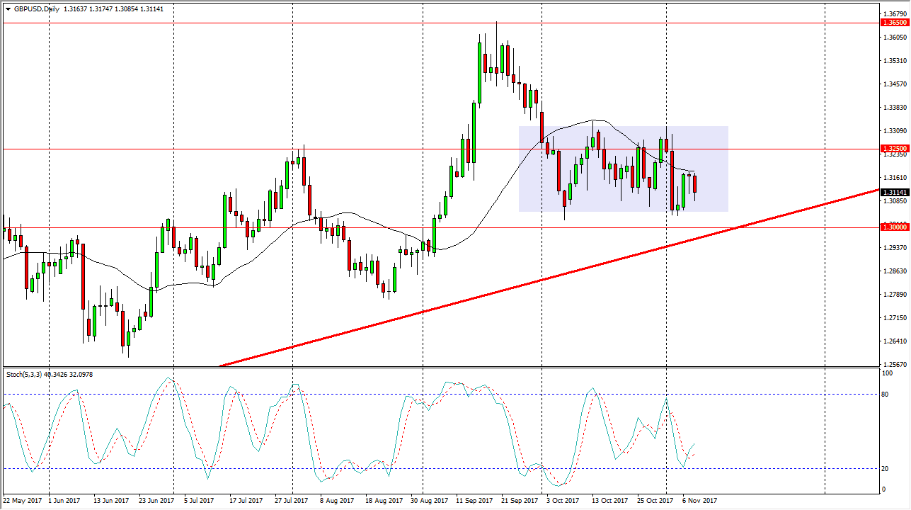 The British pound fell during the trading session on Wednesday, as we continue to go sideways in general. The purple rectangle on the chart looks very likely to continue to contain this market, but the uptrend line and the 1.30 level underneath look likely to hold the market higher. I think that every time we do get a little bit of a bounce, it’s likely that we will go looking towards the 1.3250 region, which extends to the 1.3333 handle. If we can break above there, then the market is likely to go looking towards 1.35, followed by the 1.3650 level. I think there is a significant amount of interest in buying this pair currently, but if we were to break down below the 1.30 level, the market will probably unwind to the 1.2750 level rather quickly. However, I believe that there’s only about a 20% chance that happens.