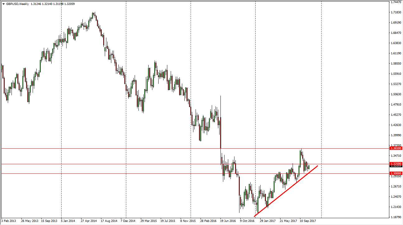The GBP/USD pair rallied a bit over the last month after initially falling with significance, but as you can see on the weekly chart, I have an uptrend line holding support, and I also recognize that the 1.30 level underneath should be a bit of a floor going forward, ultimately, I think that the market should continue to go much higher, via the 1.3250 level, and then perhaps the 1.35 handle. I think that the 1.3650 level above being broken to the upside would be a very bullish sign, as it would wipe out the losses from the gap down after the surprise boat to leave the European Union. If that happens, I think it’s only a matter of time before we go to the 1.48 level.