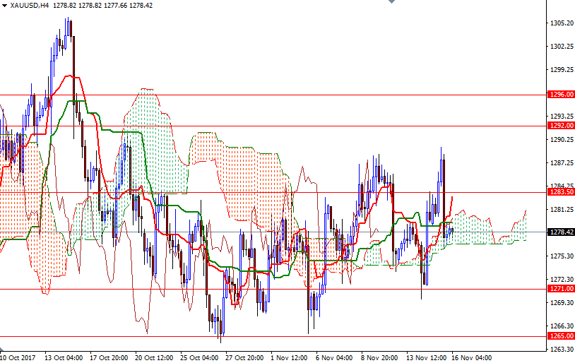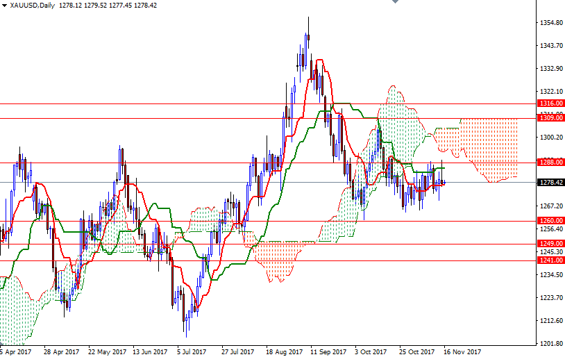 Gold prices ended Wednesday slightly lower after a volatile session. XAU/USD climbed above 1283.50 and tested the resistance around the 1288 level, but it was unable to pass through. As a result, the market returned to the Ichimoku cloud on the 4-hour chart. The yellow metal saw pressure after a report released by the Commerce Department showed that retail sales rose 0.2% in October.