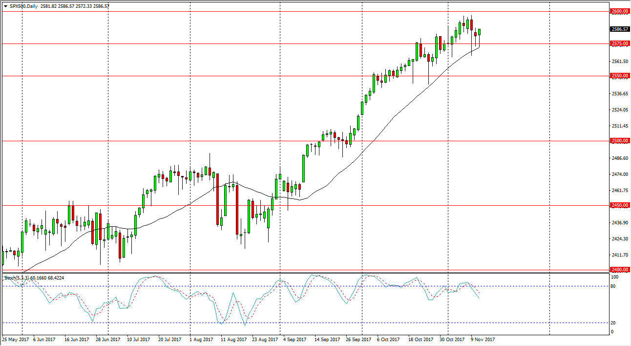 The S&P 500 fell during the trading session on Monday, breaking below the 2575 level early in the day. However, we turned around to form a hammer and it suggests that we are going to continue to try to reach the 2600 level, if not break above it. This is a very bullish looking market, but I believe that short-term buying is about all you can do as we are getting to be a bit overdone. Once we finally break above the 2600 level, momentum should pick up again. So, I think short-term traders will continue to jump into this market and pick up little dips, but at this point it is probably more or less just algorithmic trading and scalping that we will be seen. I have no interest in shorting regardless, as it’s obviously a fool’s errand to try to do so.