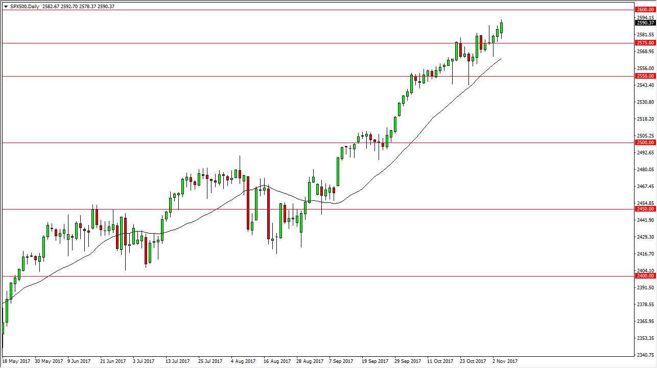 The S&P 500 initially fell during the trading session on Monday, but found enough support just above the 2575 handle to turn around and continue to rally. I believe that the market is going to go looking towards the 2600 level above, and perhaps break above there given enough time. I believe that the S&P 500 should continue to be bullish, as we have seen so much in the way of buying opportunities in the past. I believe the pullbacks should find buyers near 2575, and then of course the 2550 handle under there. The market has been in a longer-term uptrend, and I believe that the market should continue to go higher, but I also recognize that we desperately need some type of pullback. We are overextended, and quite frankly I am not very interested in trying to buy at these extreme levels. I believe that the market desperately needs to pull back, but the algorithmic traders are not allowing it to happen.
