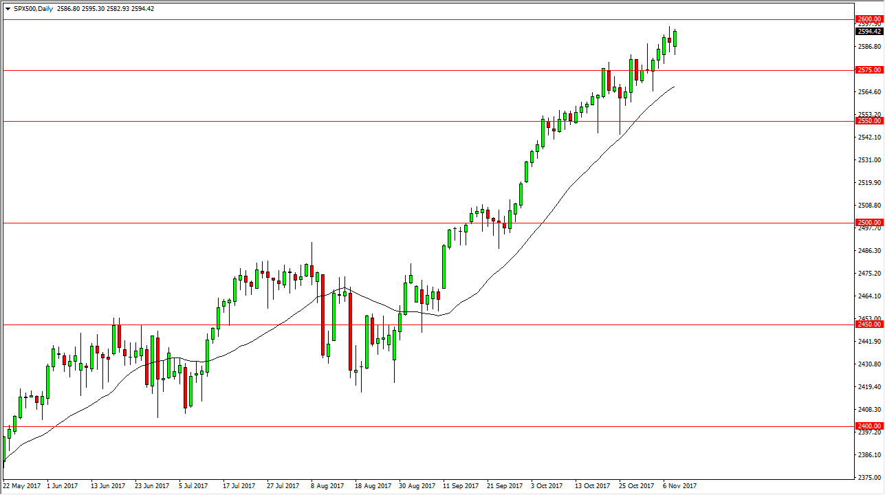 The S&P 500 initially fell during the trading session on Wednesday, but turned around to form a bullish candle. We have been grinding relentlessly towards the 2600 level, and I think that area is certainly the short-term target. The problem of course is that the market has not had a significant pullback in quite some time. Because of this, I think that it is only a matter of time before we get that pullback, perhaps reaching down to the 2550 handle. So, in the short term, I believe that the market will continue to rally, but I also recognize that a pullback must have been relatively soon, otherwise the market could be setting itself up for a very drastic pullback. At this point, I am very suspicious of the rally, although I certainly wouldn’t be a seller.