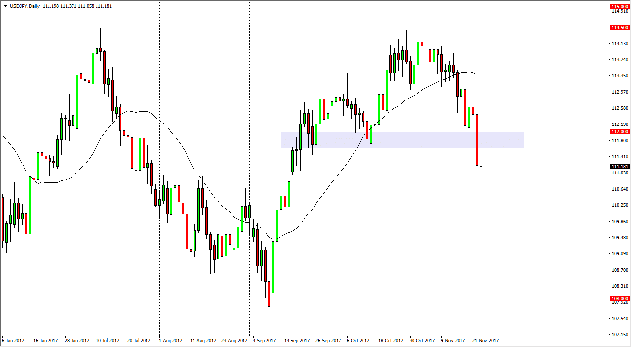 The US dollar did very little against the Japanese yen during the trading session on Thursday, which would not be a huge surprise considering that the Americans would have been away for Thanksgiving. After a massive move to the downside on Wednesday, and more importantly a slice below the 112 handle, it looks likely that the market is ready to go towards the bottom of the overall consolidation longer term. The 108 level is the bottom of the consolidation, and I believe that the 114.50 level above is the beginning of significant resistance. Because of this, I think that this market is going to offer a trading opportunity to the downside, at least for the next couple of weeks.